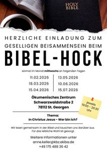 Der Bibel-Hock findet einmal im Monat mittwochs abends statt. Termine entnehmen Sie bitte dem Flyer. Bei Fragen wenden Sie sich gerne bei Diakonin Anne Keller unter 0175 488 36 42 oder anne.keller@kbz.ekiba.de.